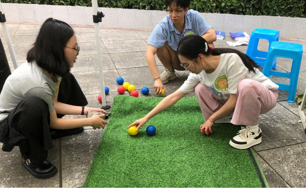 “烦恼对对碰”中,同学们在一块仿真草坪上击打目标球体,通过三次投射机会实现压力具象化转移,就像把烦心事打包丢进垃圾桶一样,物理击打能让人直观感受到释放,在球与球的碰撞中,抛开焦虑,迎接多巴胺。