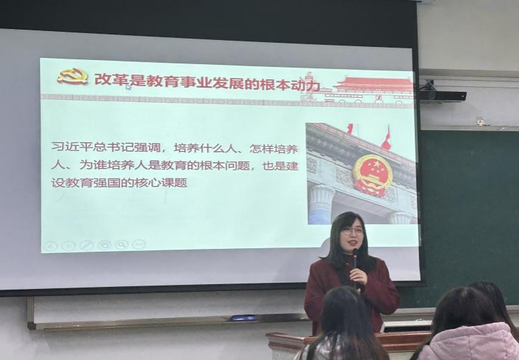随后,张信老师主讲了第一次宣讲,从“充分认识新时代新征程深化教育综合改革的重大意义”“深刻认识党的十八大以来教育综合改革取得的显著成就”以及“扎实抓好深化教育综合改革的重点举措落实”三个方面做了系统阐述。张信老师表示,教育是国之大计,党之大计,教育兴则国家兴,面对新时代中国特色社会主义蓬勃发展,为在“强国有我”的号角中发出独属于青年人的声音,我们应深入学习贯彻党的二十届三中全会精神,并内化于心,指导行动。张信老师结合自身辅导员以及团总支书记的身份特点,将工作中的所见所得和与员工切实利益相关的方面结合起来,生动讲述了教育综合改革中的重点要点。