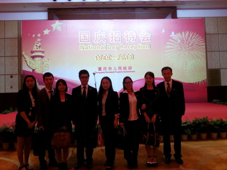 9月29日,重庆市政府在南坪凯宾斯基酒店召开了国庆招待会,隆重庆祝中华人民共和国64周年华诞。市领导杜黎明、刘强、张玲,在渝各领馆官员及夫人, 外籍专家学者, 外国企业代表和在渝港澳台人士、华侨华人代表共250余人参加了招待会。