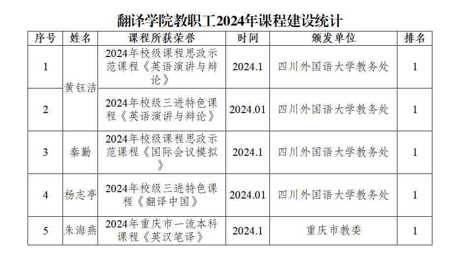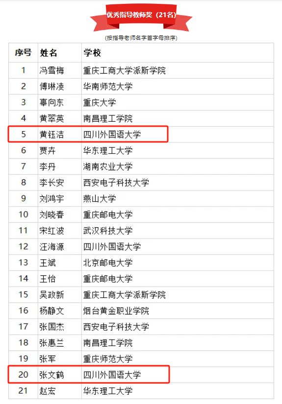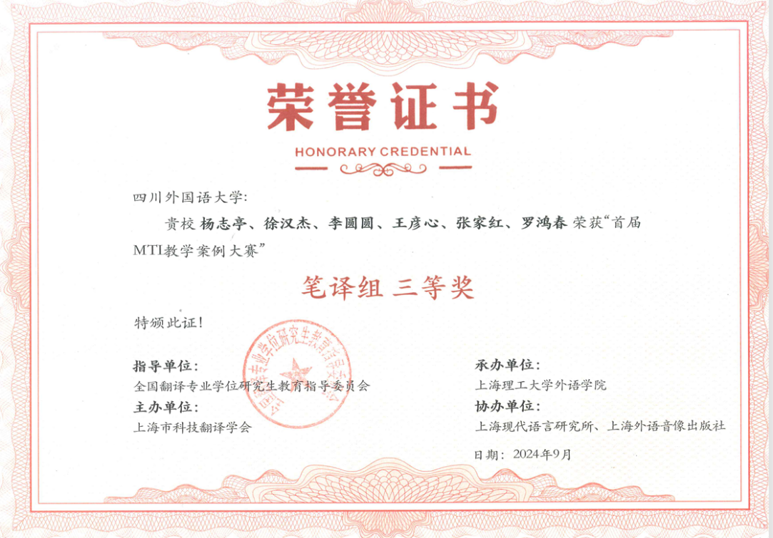 公司教师黄钰洁在第十五届“外教社杯”全国高校外语教学大赛重庆赛区决赛中荣获特等奖,并勇夺全国总决赛翻译专业组比赛一等奖;杨志亭老师领衔的团队(杨志亭、徐汉杰、李圆圆、王彦心、张家红、罗鸿春)在全国首届 MTI 教学案例大赛中,提交的参赛作品“讲好重庆能源故事 助塑中国科技形象——以《提升能源供给含‘绿’量》文本翻译为例”获笔译组三等奖;顾环老师的微课作品《如果国宝会说话-漂洋过海“寻瓷记”》在重庆市本科高校微课大赛中荣获二等奖;李希希老师在重庆市青年教师授课大赛中获二等奖;钟毅老师在重庆市教学创新大赛中获得正高组三等奖;李亮老师的思政案例《以文化育人 传中国家风---明陞m88官方网站特色三全育人》在“重庆市‘大思政课’建设文化育人典型案例征集评选活动”中荣获二等奖。
