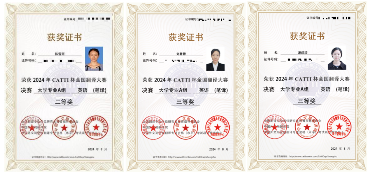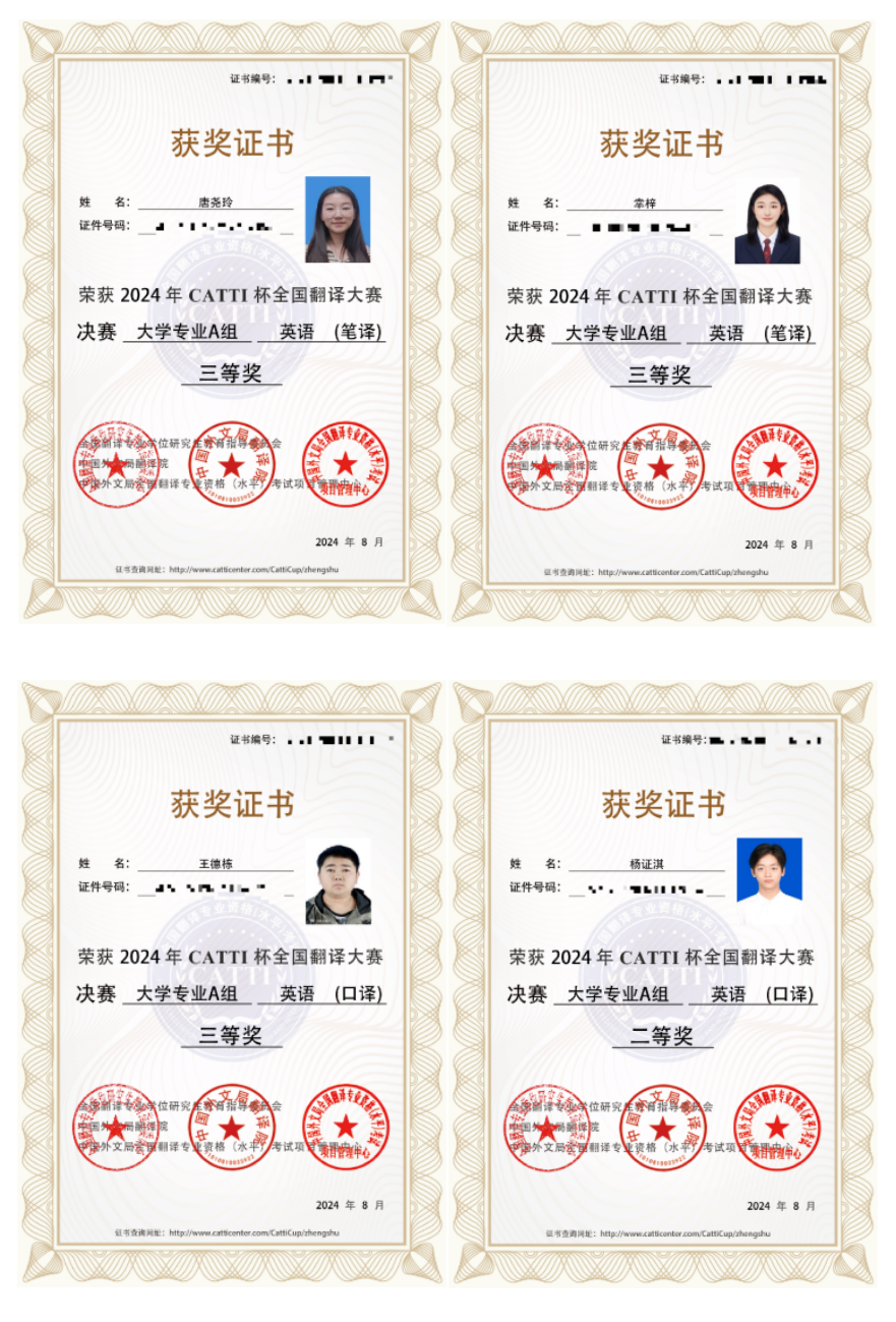 2024年第三届CATTI杯全国翻译大赛决赛中,公司2021级本科生陈雪雨获得大学组英语笔译二等奖,2023级研究生刘朦朦、谭煜颖、唐尧玲、幸梓获得大学组英语笔译三等奖,2021级本科生杨证淇获得大学组英语口译二等奖,2023级研究生王德栋获得大学组英语口译三等奖。