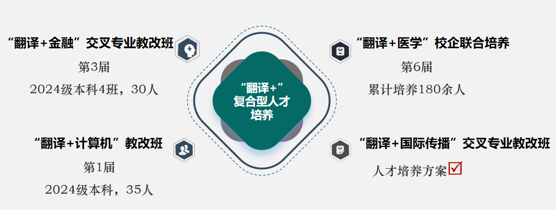公司顺应新文科发展导向,持续深化翻译复合型人才培养改革,以“翻译+”为特色,构建多层次复合培养体系,为创新人才培养找准突破口。努力培养有家国情怀、“一专多能”、“一精多会”的复合型翻译人才,服务国家战略发展。