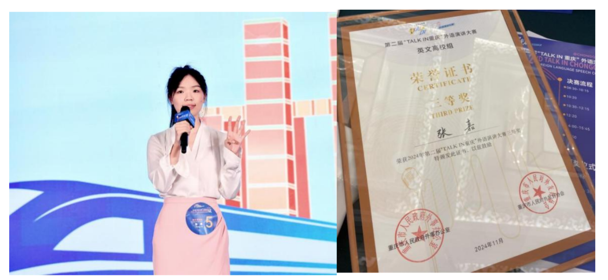 在第二届“TALKIN重庆”外语演讲大赛中,2022级本科生黎予涵获英文高校组二等奖;2023级硕士研究生宋男杰、张嘉、邓一帆分别荣获英文高校组三等奖和优秀奖。