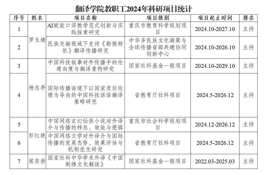 公司教职工完成国家社科外译项目结题2项;获批国家社科基金项目一项;获批市教委、学校等各级各类科研立项7项。李金树教授领衔的“中国翻译批评史”团队获批学科办立项团队。